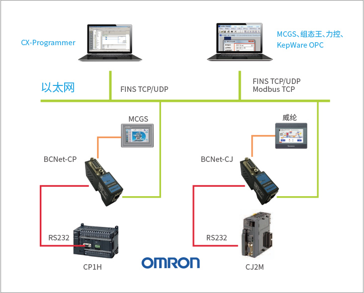 BCNet-CP采用即插即用設(shè)計,不占用PLC通訊口,即編程軟件/上位機軟件通過以太網(wǎng)對PLC數(shù)據(jù)監(jiān)控的同時,觸摸屏可以通過復(fù)用接口與PLC進行通訊。BCNet-CP支持工控領(lǐng)域內(nèi)絕大多數(shù)SCADA軟件,支持歐姆龍FINS TCP/UDP以太網(wǎng)協(xié)議和ModbusTCP兩種通訊方式。