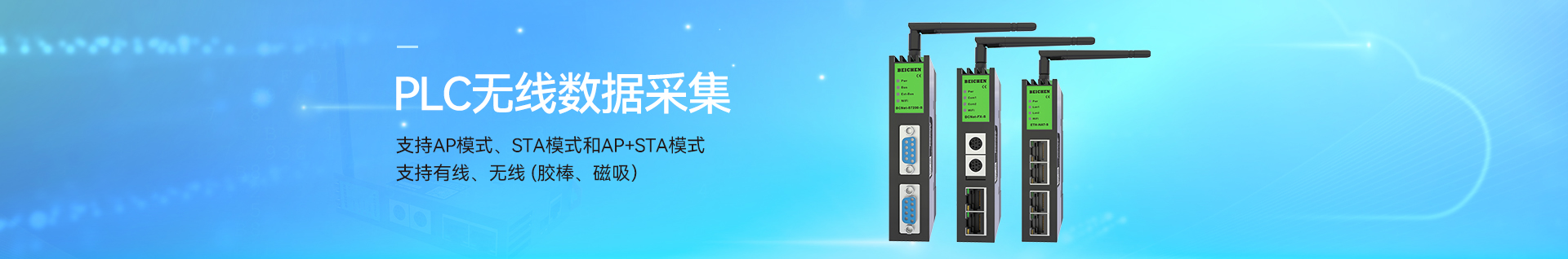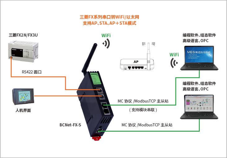產(chǎn)品簡介 BCNet-FX-S用于三菱FX1S/1N/2N/3S/3G/3GA/3GC/3U/3UC系列、匯川、士林AX、禾川、維控等PLC以太網(wǎng)數(shù)據(jù)采集,非常方便構(gòu)建生產(chǎn)管理系統(tǒng)。模塊集成WiFi功能,支持AP模式、STA模式和AP+STA模式,帶膠棒和磁吸天線,方便構(gòu)建WiFi網(wǎng)絡,直接通過WiFi進行PLC編程、數(shù)據(jù)采集。不占用PLC編程口,上位機通過以太網(wǎng)對PLC數(shù)據(jù)監(jiān)控的同時,觸摸屏可以通過復用接口X2與PLC進行通訊。支持工控領域內(nèi)絕大多數(shù)SCADA軟件,支持三菱MC以太網(wǎng)協(xié)議和ModbusTCP主從站通訊。 支持點表探測功能。