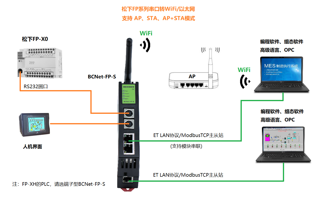 BCNet-FP-S用于松下FP-XH、FP-X、FP-X0、FP0、FP0R、FP2SH系列PLC的以太網(wǎng)數(shù)據(jù)采集,非常方便構(gòu)建生產(chǎn)管理系統(tǒng)。模塊集成WiFi功能,支持AP模式、STA模式和AP+STA模式,帶膠棒和磁吸天線,方便構(gòu)建WiFi網(wǎng)絡(luò),直接通過WiFi進行PLC編程、數(shù)據(jù)采集。