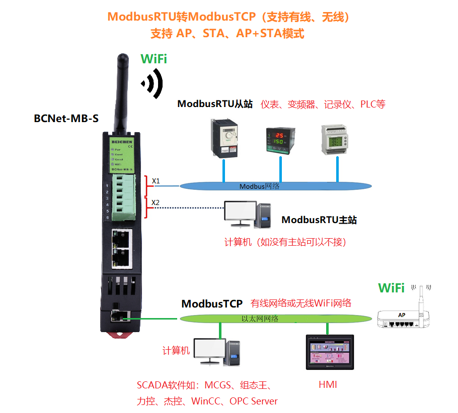 BCNet-MB-S用于ModbusASCII/RTU設(shè)備(儀表、變頻器、PLC等)的以太網(wǎng)數(shù)據(jù)采集,模塊集成WiFi功能,支持AP模式、STA模式和AP+STA模式,帶膠棒和磁吸天線,方便構(gòu)建WiFi網(wǎng)絡(luò),直接通過(guò)WiFi進(jìn)行ModbusASCII/RTU設(shè)備編程、數(shù)據(jù)采集。