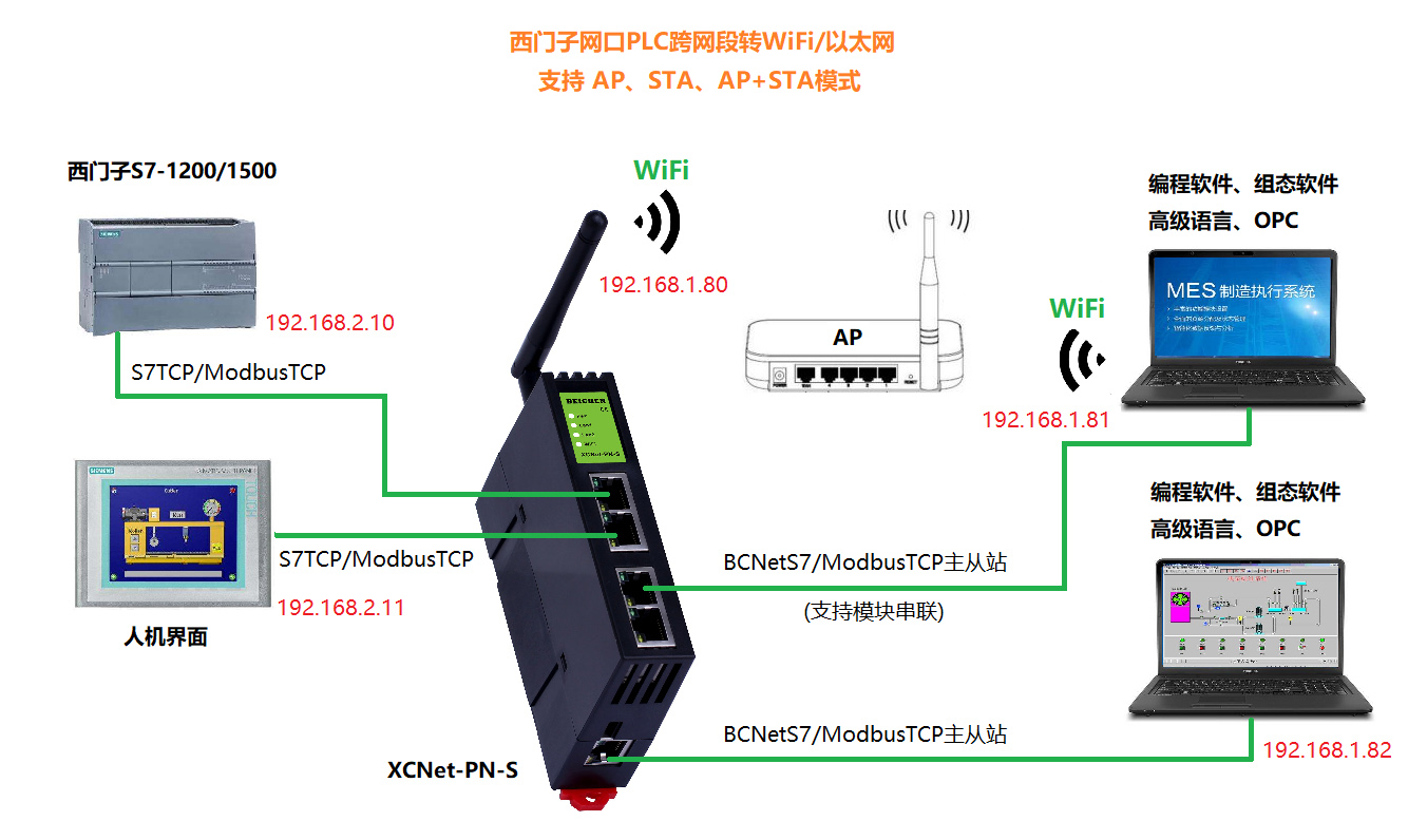 XCNet-PN-S是一款高性能協(xié)議轉(zhuǎn)換網(wǎng)關(guān),是為滿足日益增多的工廠設(shè)備信息化需求(設(shè)備網(wǎng)絡(luò)監(jiān)控和生產(chǎn)管理)而設(shè)計(jì),用于西門子帶以太網(wǎng)接口的PLC(S7-1200/1500、S7-300PN、S7200 SMART等)、西門子以太網(wǎng)模塊(CP243-1、CP343-1等)的以太網(wǎng)數(shù)據(jù)采集,非常方便構(gòu)建生產(chǎn)管理系統(tǒng)。 模塊集成WiFi功能,支持AP模式、STA模式和AP+STA模式,帶膠棒和磁吸天線,方便構(gòu)建WiFi網(wǎng)絡(luò),直接通過WiFi進(jìn)行PLC編程、數(shù)據(jù)采集、數(shù)據(jù)交換和跨網(wǎng)段訪問。