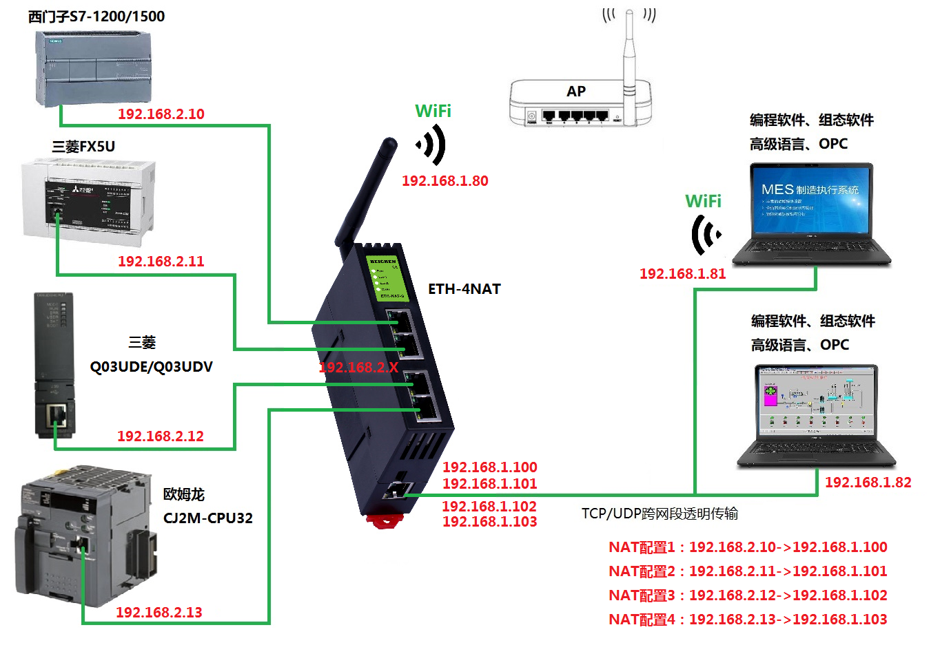 ETH-4NAT可以同時實(shí)現(xiàn)4路NAT的地址轉(zhuǎn)換的功能,即可將LAN1所連PLC設(shè)備,映射到LAN2口或WiFi接口的任意IP地址,解決了現(xiàn)場設(shè)備無法修改IP地址的問題。