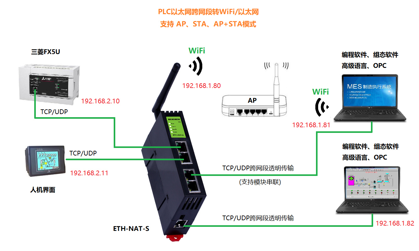 ETH-NAT-S適用于所有網(wǎng)口PLC(TCP/UDP協(xié)議)網(wǎng)絡(luò)通訊和數(shù)據(jù)采集,兼有跨網(wǎng)段和透明傳輸?shù)墓δ?。車間單個設(shè)備,如果具有相同的IP地址,則可以轉(zhuǎn)換成不同的IP地址,進(jìn)行數(shù)據(jù)采集;車間多個設(shè)備,不同網(wǎng)段的IP地址,則可以統(tǒng)一成同一網(wǎng)段的IP地址,進(jìn)行數(shù)據(jù)采集。 模塊集成WiFi功能,支持AP模式、STA模式和AP+STA模式,帶膠棒和磁吸天線,方便構(gòu)建WiFi網(wǎng)絡(luò),直接通過WiFi進(jìn)行PLC編程、數(shù)據(jù)采集和跨網(wǎng)段訪問。