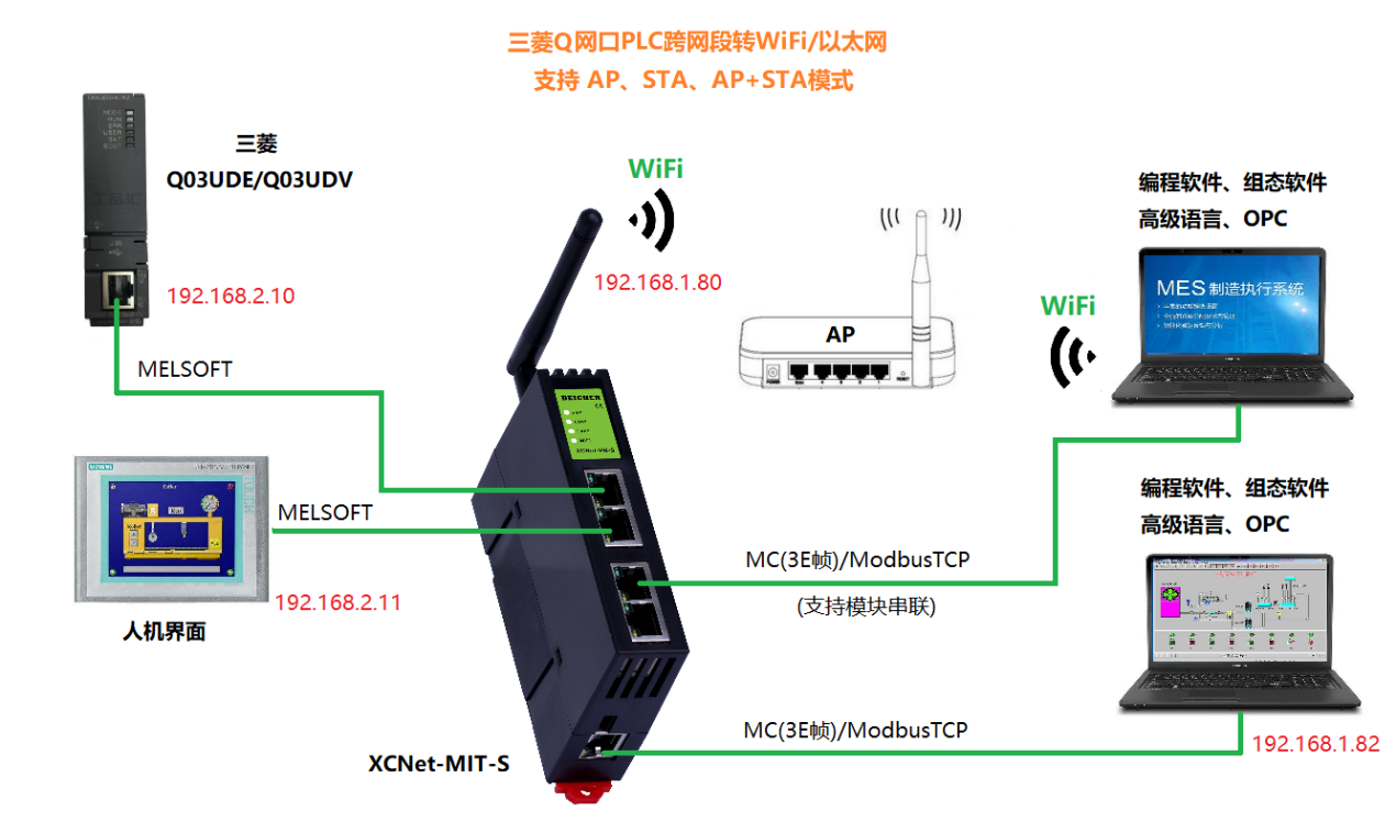 XCNet-MIT-S具備LAN1、LAN2兩個(gè)物理性接口,可將LAN1口所連接PLC的IP地址和端口號(hào),映射到LAN2口的任意IP和端口號(hào)。XCNet-MIT-S可將LAN1口的三菱MELSOFT協(xié)議自動(dòng)映射成LAN2口的ModbusTCP協(xié)議和MC(3E幀)服務(wù)器。 模塊集成WiFi功能,支持AP模式、STA模式和AP+STA模式,帶膠棒和磁吸天線,方便構(gòu)建WiFi網(wǎng)絡(luò),直接通過(guò)WiFi進(jìn)行PLC編程、數(shù)據(jù)采集、數(shù)據(jù)交換和跨網(wǎng)段訪問(wèn)。