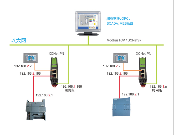 XCNet-PN的LAN1/LAN2具備跨網(wǎng)段功能,能將LAN1口的S7TCP協(xié)議轉(zhuǎn)換成LAN2口的ModbusTCP協(xié)議和BCNetS7(S7TCP/IP)協(xié)議,LAN2支持ModbusTCP主從站通訊功能。